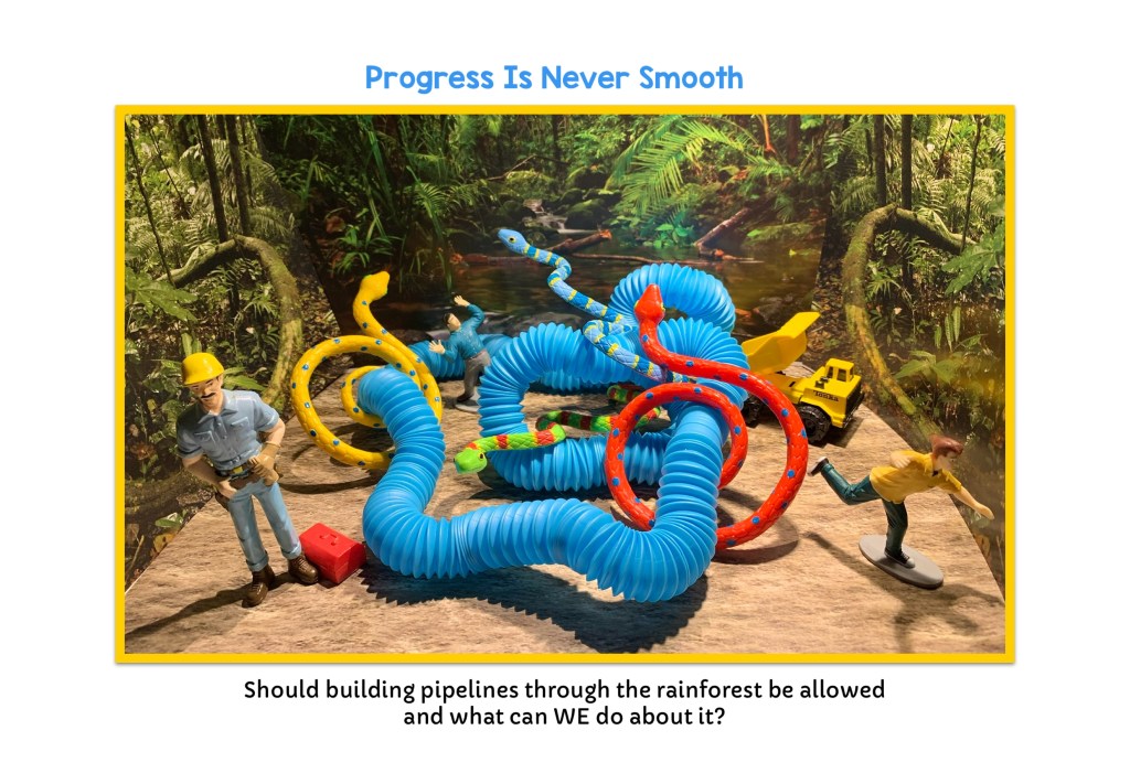 Restless and pandemic-weary but very concerned about the state of our world, I began my “Diorama Dramas” project in the late fall of 2022. I had an 11×17” lightbox built in my front garden and every ten days or so have been creating a new diorama. They explore challenging social or environmental issues with a playful and lighthearted touch, using miniature animals, figures, toys and bright coloured photographic backgrounds. Passers-by, often with children in tow, stop to view and discuss the ephemeral creations within the lightbox.