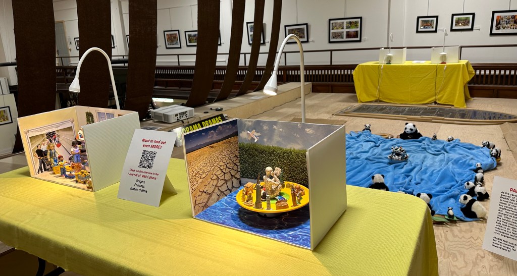 After my solo show at 918 Bathurst in May 2023, I again entered the Contact Photography Festival and exhibited in a little-known art gallery on the Danforth from June 1st until September 1st, 2024. For this show, I received Exhibition Assistance from the Government of Ontario through the Ontario Arts Council. The show consisted of four 3D dioramas, (each with lights and movement), 35 photographs of dioramas (five of them large scale) and a large floor installation. The books I created, both adult and child versions, were also available for sale at the exhibition. CBC radio (Metro Morning with David Common) did an interview with me that aired on July 24th. CityNews came to the gallery and created a segment which aired several times, beginning on Aug. 5th. (Find them in the PRESS tab.) I held a successful Artist’s Talk on Aug. 22nd, which included a screening of PANDALAND, a 25 min. slide show and tour of the gallery.